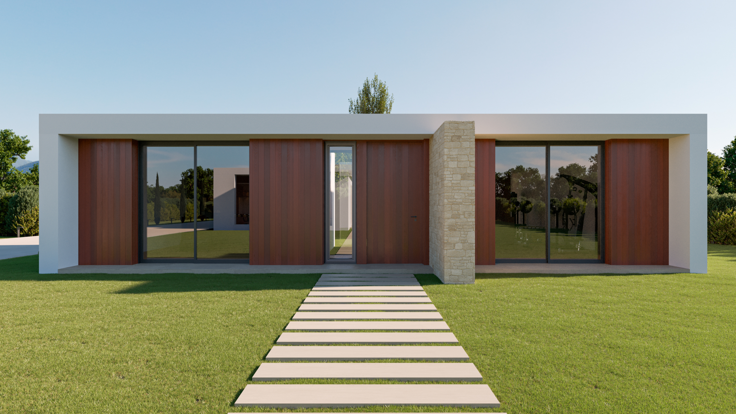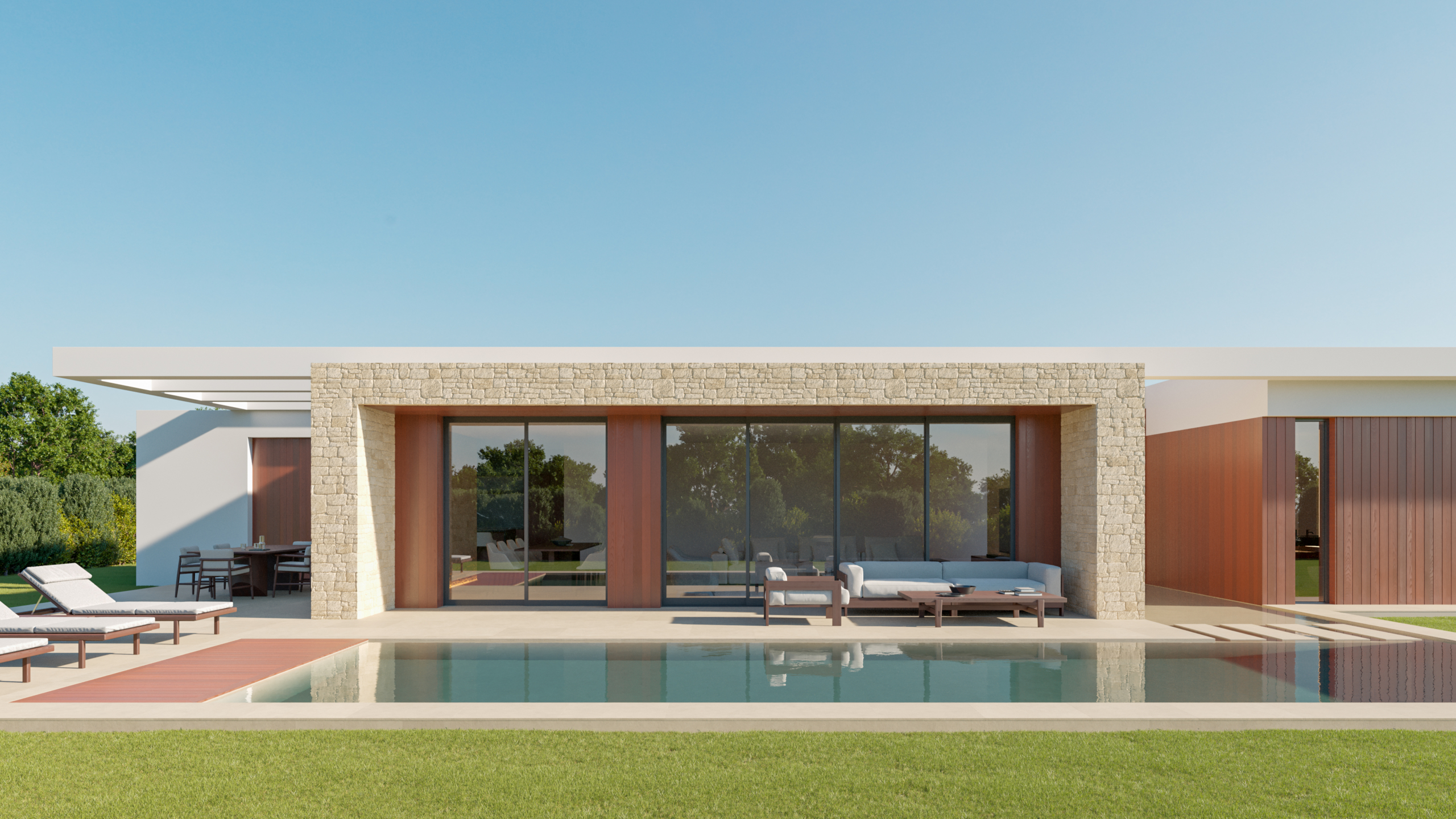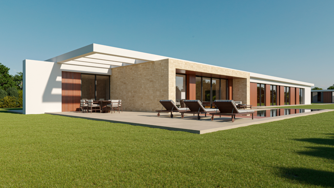 Constanza tiene un diseño moderno y minimalista, caracterizado por líneas rectas y materiales naturales. La fachada principal combina elementos de piedra beige en bloques grandes con paneles de madera cálida y grandes ventanales de vidrio que proporcionan una conexión directa con el exterior, aportando luminosidad al interior.