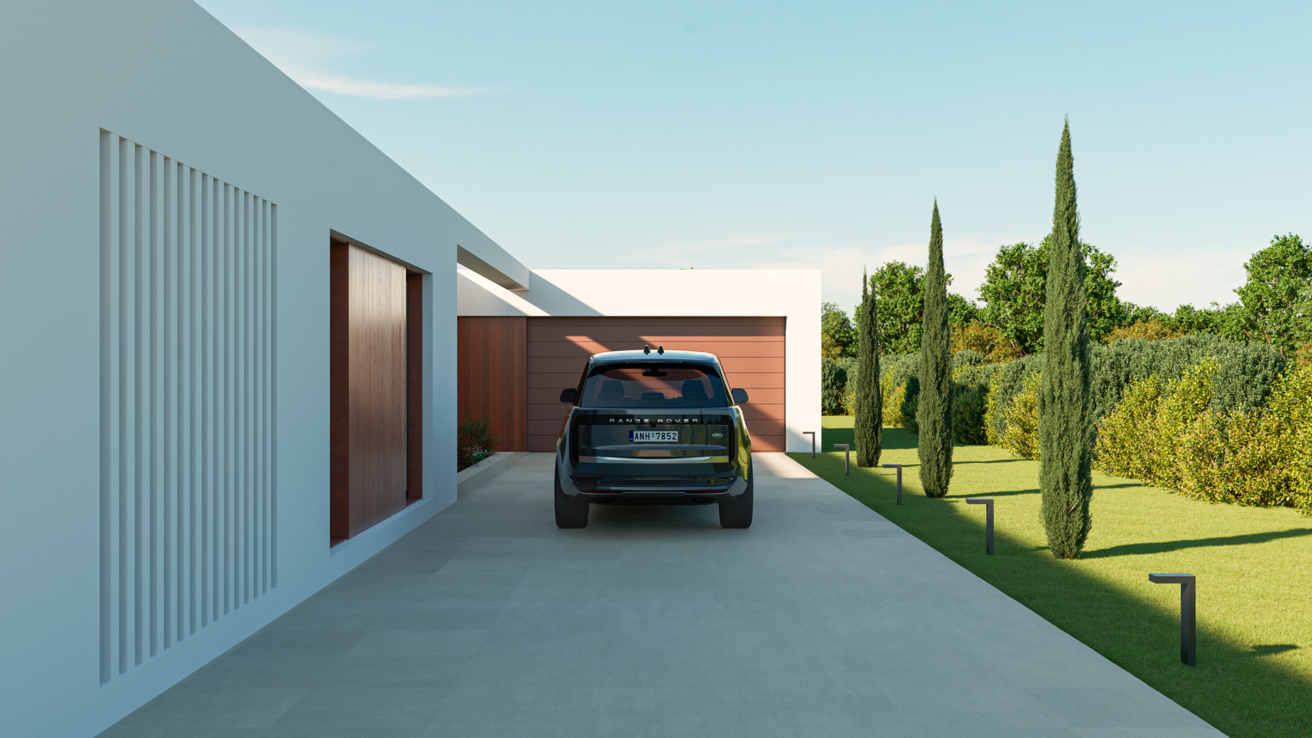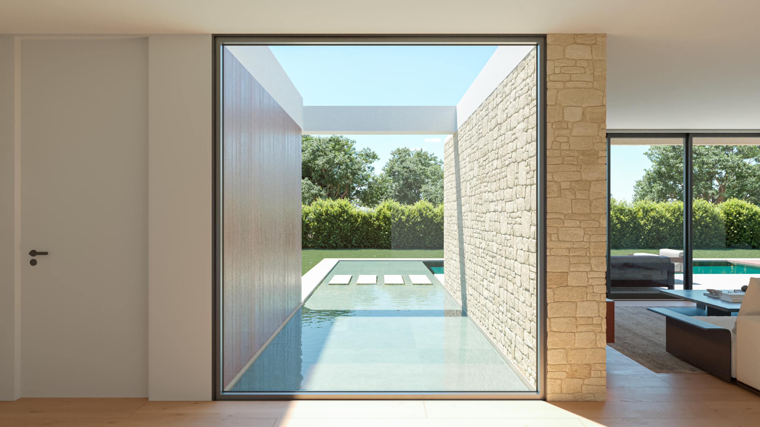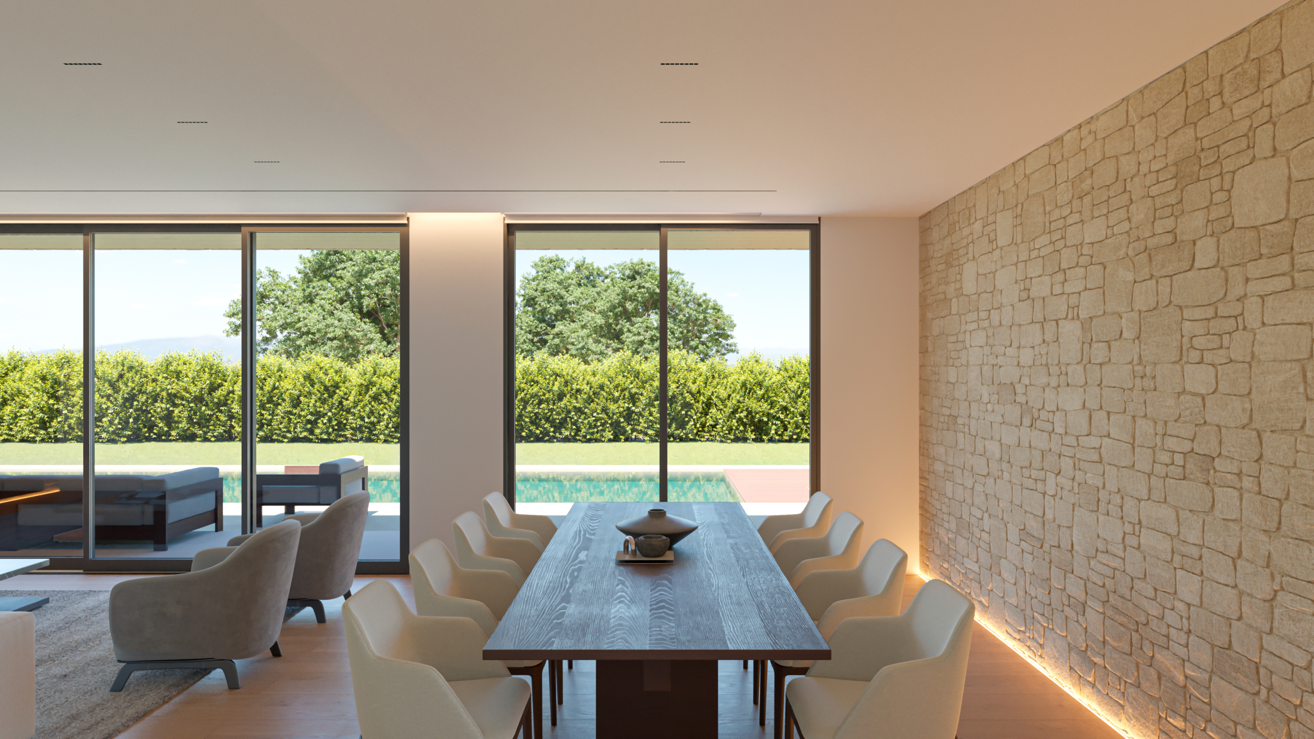 Constanza tiene un diseño moderno y minimalista, caracterizado por líneas rectas y materiales naturales. La fachada principal combina elementos de piedra beige en bloques grandes con paneles de madera cálida y grandes ventanales de vidrio que proporcionan una conexión directa con el exterior, aportando luminosidad al interior.