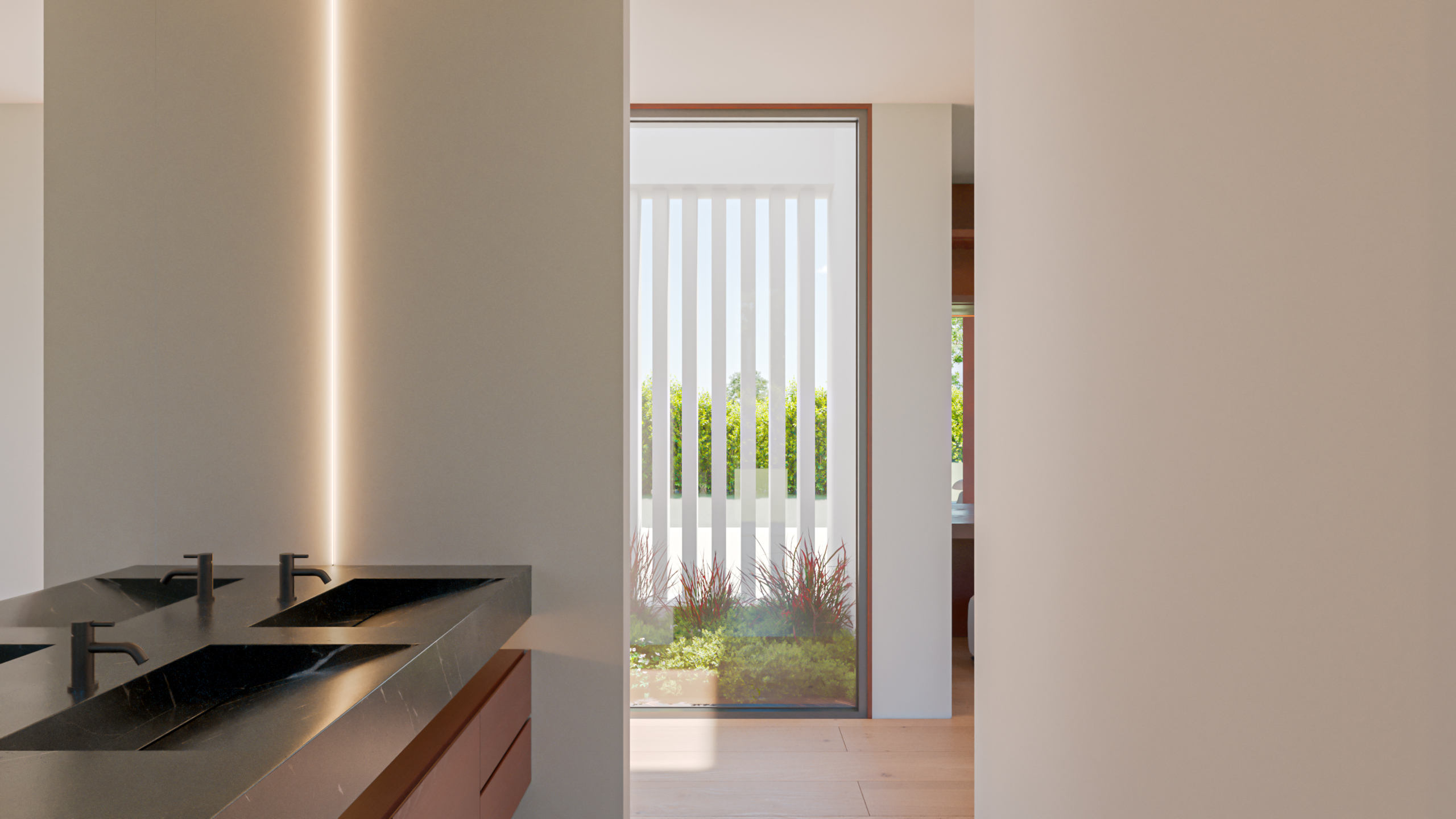 Interior luminoso y abierto, gracias a sus amplios ventanales. Los espacios están diseñados con líneas limpias y acabados elegantes, creando un ambiente minimalista y acogedor.