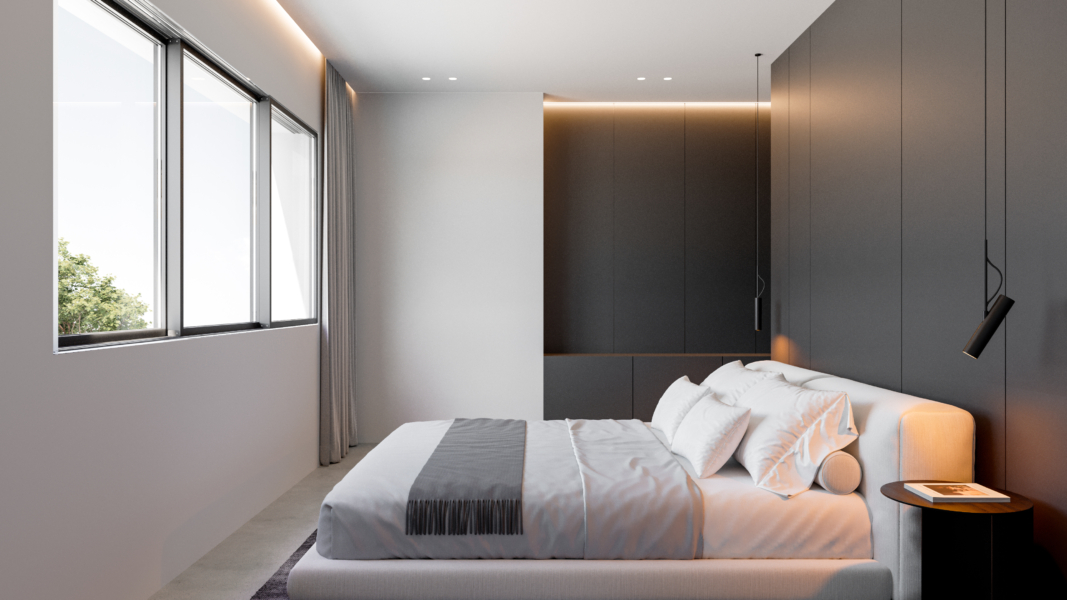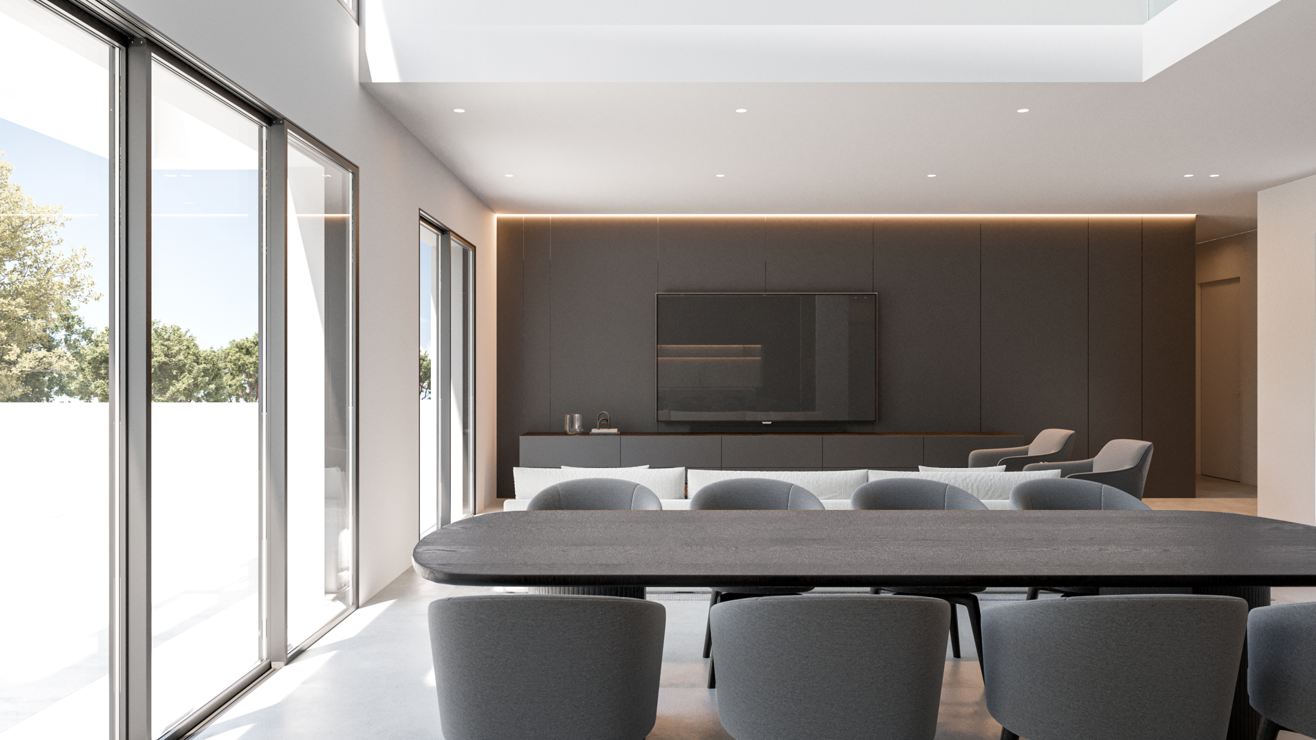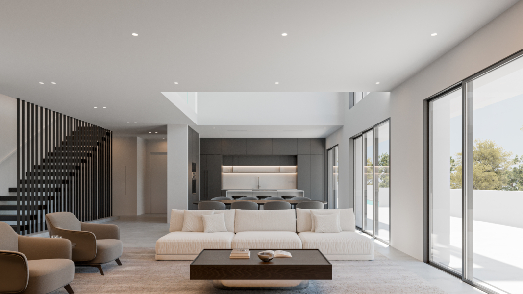 Interior luminoso y abierto, gracias a sus amplios ventanales. Los espacios están diseñados con líneas limpias y acabados elegantes, creando un ambiente minimalista y acogedor.